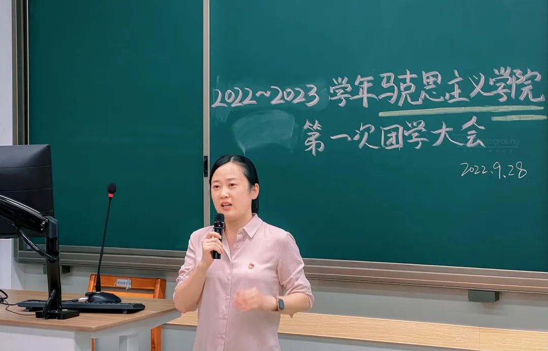 于文新楼223室召开2022-2023学年团委、学生会第一次全体大会。学院党委副书记梅淑宁、学院兼辅黄倩倩及全体团学干部参加本次大会。